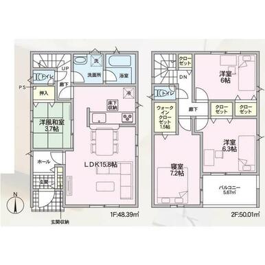 号棟番号:2号棟 幅員制限による容積率 延床面積に別途ルーフバルコニー約5.67平米有り |